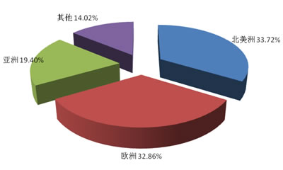 2013年,我國共向195個國家和地區(qū)出口醫(yī)用敷料。從出口區(qū)域看,北美洲是我國醫(yī)用敷料最大的出口市場,出口額為8.03億美元,同比下降2.03%,所占比重為33.72%;歐洲為第二大出口市場,出口額為7.82億美元,同比增長7.16%,比重為32.86%;亞洲排第三位,出口額為4.62億美元,同比增長2.58%,比重為19.4%。三大洲所占比重達到85.98%。